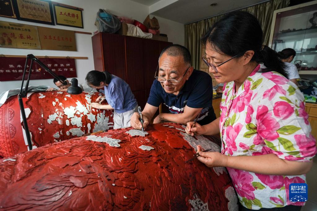 中國工藝美術(shù)大師張來(lái)喜(右二)在工作室與同事交流制作揚州紅雕漆作品(6月15日攝)。