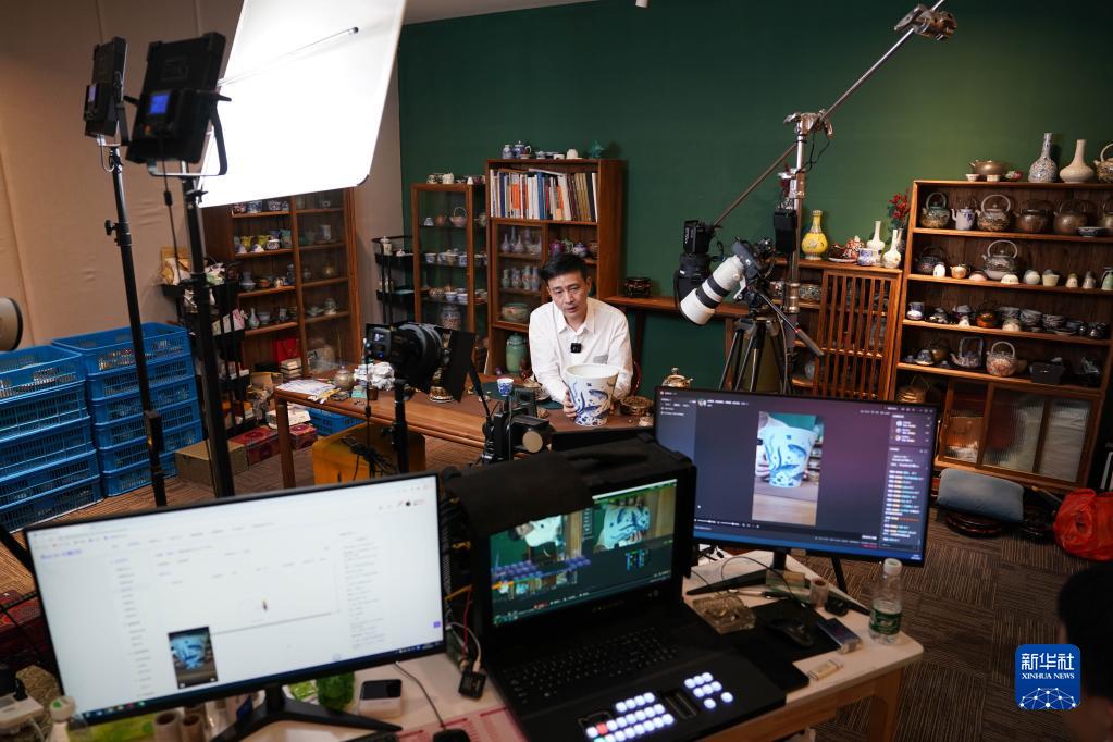 在景德鎮陶溪川文創(chuàng )街區的直播基地里,工作人員通過(guò)網(wǎng)絡(luò )直播推介陶瓷產(chǎn)品(2月22日攝)。