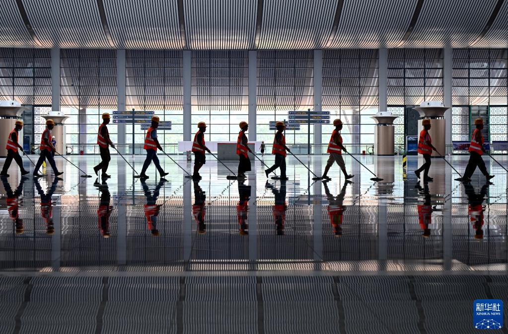 6月19日,清潔工人在福廈高鐵新建廈門(mén)北站候車(chē)大廳清潔地面。