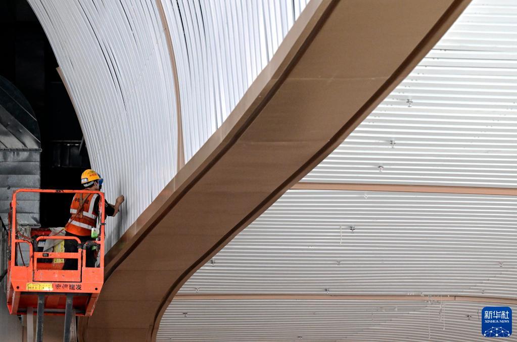 6月19日,工人在福廈高鐵新建廈門(mén)北站候車(chē)大廳檢查安裝好的鋁條板。