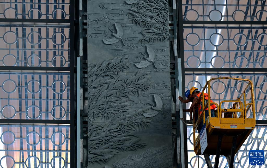 6月19日,工人在福廈高鐵新建廈門(mén)北站外立面施工。