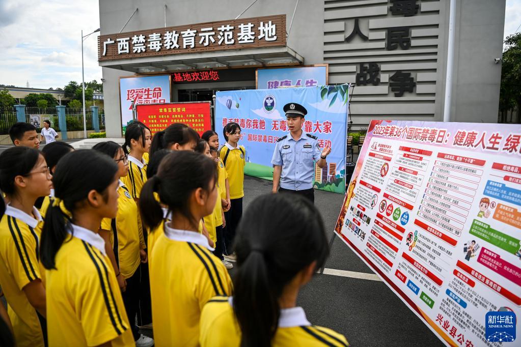 6月19日,在廣西禁毒教育示范基地,民警在做禁毒宣傳。