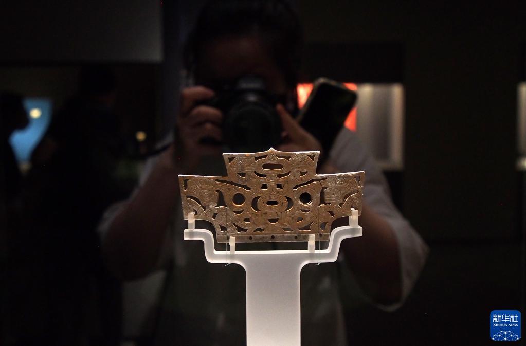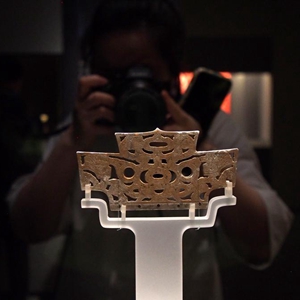 6月19日,來(lái)賓在拍攝展出的浙江余杭反山遺址16號墓出土的透雕玉冠狀器。