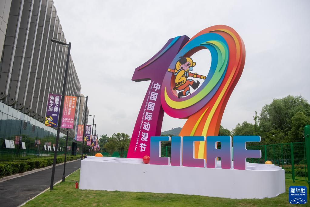 在第十九屆中國國際動(dòng)漫節主會(huì )場(chǎng)杭州白馬湖國際會(huì )展中心旁豎立的主題雕塑(6月20日攝)。