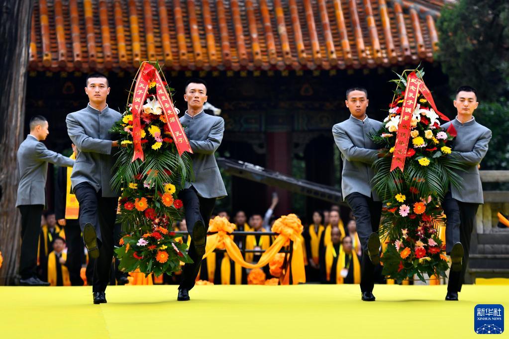 在辛丑年祭孔大典上,工作人員恭獻花籃,以紀念孔子誕辰2572年(2021年9月28日攝)。