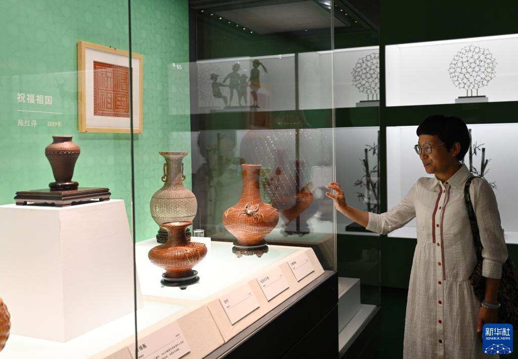 6月20日,竹編藝人陳紅萍在展覽現場(chǎng)介紹安溪的竹編工藝品。