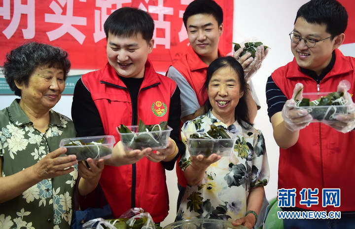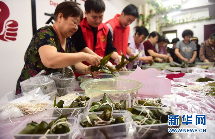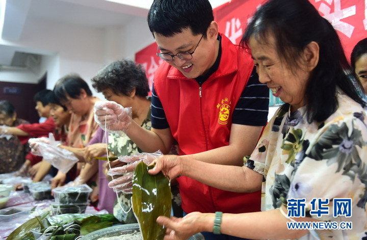6月20日,河北滄州市運河區紀委監委工作人員與雙金社區居民共同包起“廉心粽”。新華網(wǎng)發(fā)(謝辛 攝)
