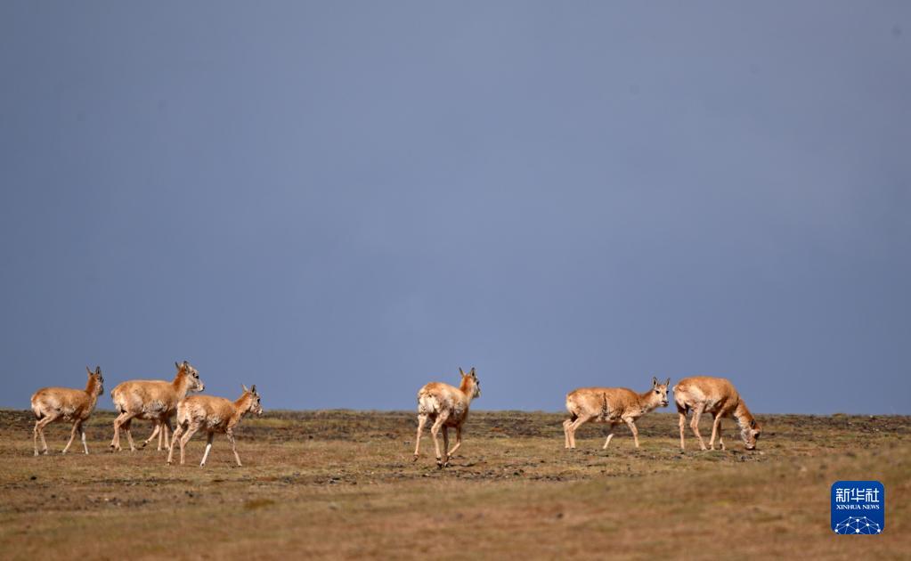 一群藏羚羊在可可西里卓乃湖區域活動(dòng)(6月17日攝)。