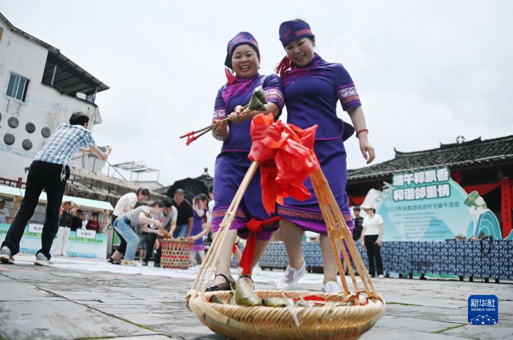6月20日,在廣西羅城仫佬族自治縣東門(mén)鎮石圍古村,群眾代表參加搶粽子比賽。