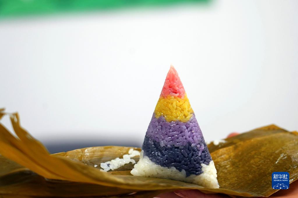 6月15日在貴州省黔東南苗族侗族自治州臺江縣排羊鄉的一處粽子生產(chǎn)車(chē)間里拍攝的五彩粽子。