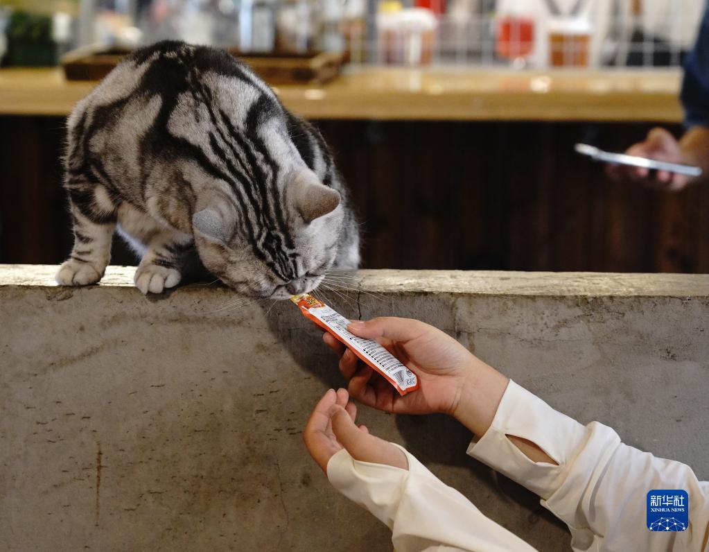 顧客在店內給貓咪喂食(6月10日攝)。