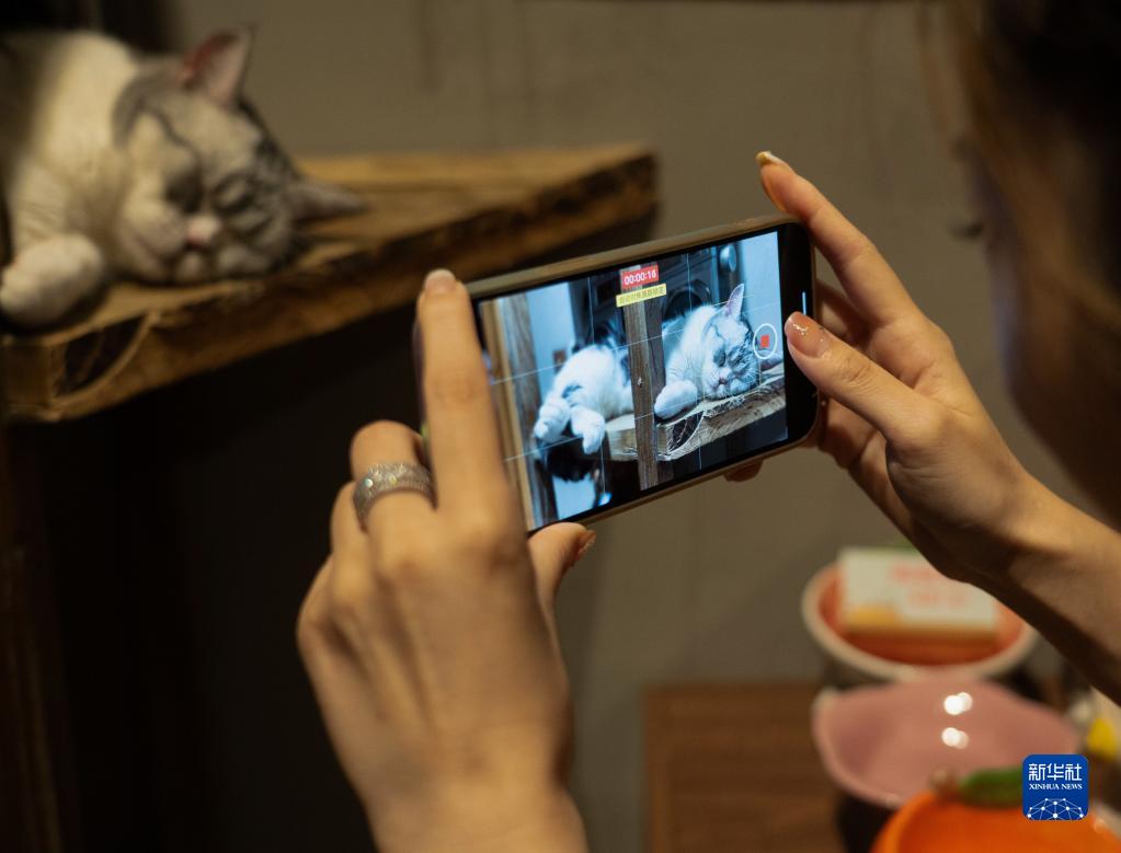一名顧客拍攝正在睡覺(jué)的貓咪“小哪吒”(6月19日攝)?!靶∧倪浮奔傺b摔倒“碰瓷”路人的視頻在網(wǎng)絡(luò )上走紅。