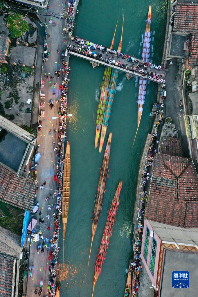 福州市長(cháng)樂(lè )區三溪村,龍舟在穿村而過(guò)的小溪中競渡迎端午(6月18日攝,無(wú)人機照片)。