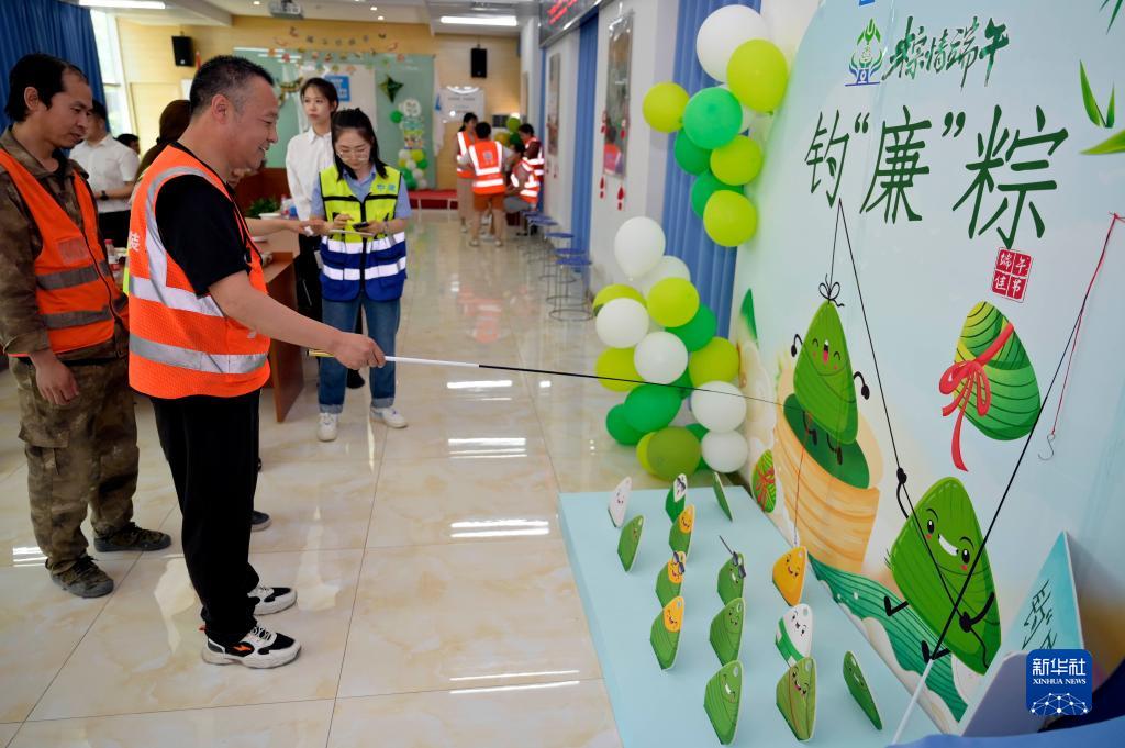 6月21日,在北京市昌平區中建二局安裝公司保利未來(lái)科技城項目上,一線(xiàn)建設者參加釣“廉”粽活動(dòng)。