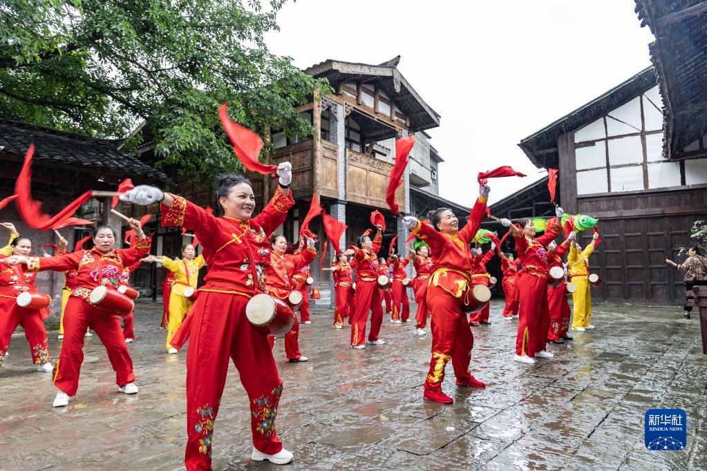 6月21日,在重慶市永川區板橋鎮板橋老街,村民進(jìn)行腰鼓表演。