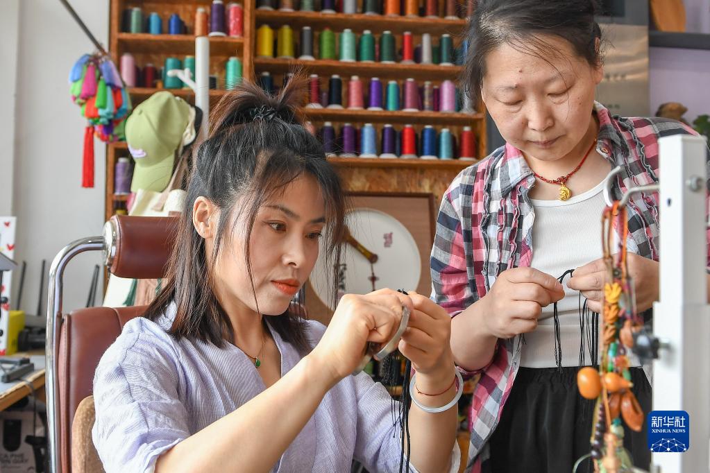 6月20日,在吉林省長(cháng)春市,徐曉雪(左)與團隊成員編繩結工藝品。