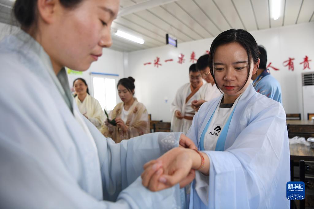 6月21日,中建三局的一線(xiàn)建設者在項目工地上佩戴自己編織的端午彩繩。