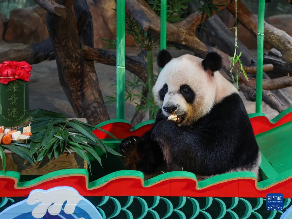 6月21日,長(cháng)隆大熊貓三胞胎帥帥在龍船上大快朵頤。