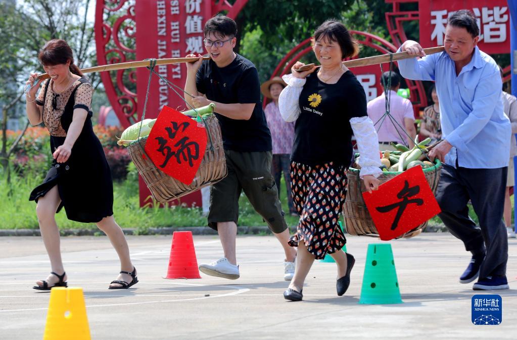 6月21日,在湖州市長(cháng)興縣和平鎮長(cháng)崗村,村民在進(jìn)行挑擔子繞障礙物比賽。