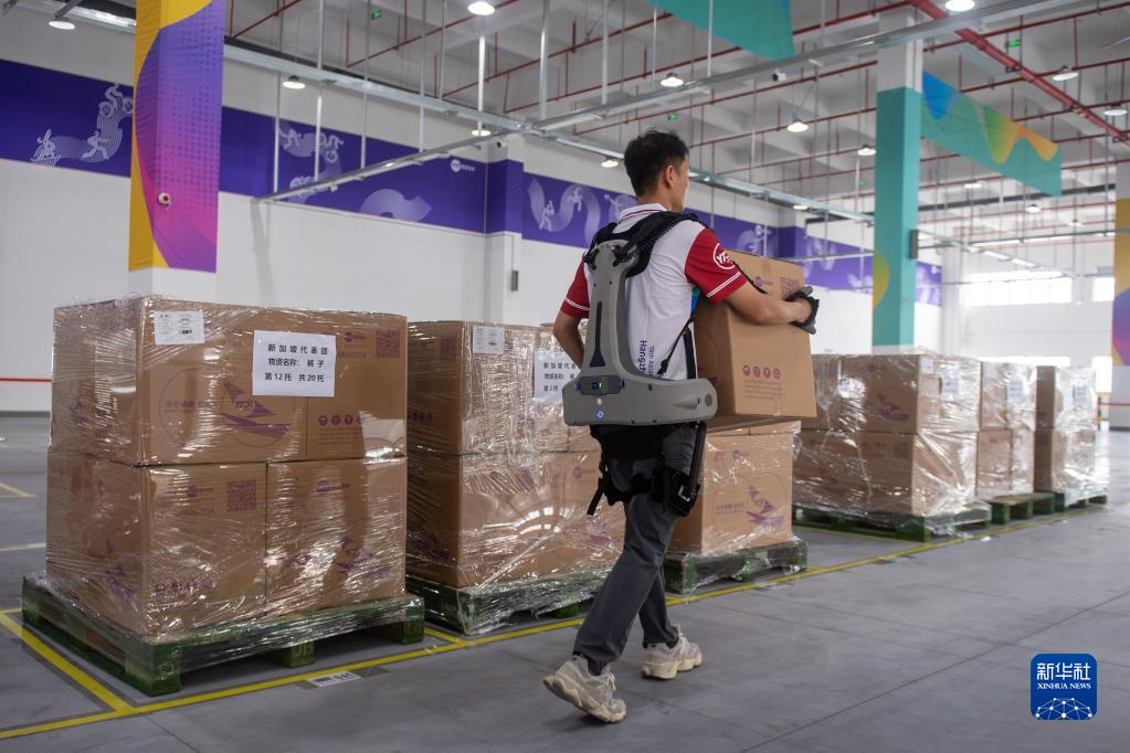 6月21日,杭州亞運會(huì )物流中心的工作人員使用外骨骼機器人輔助搬運包裹。