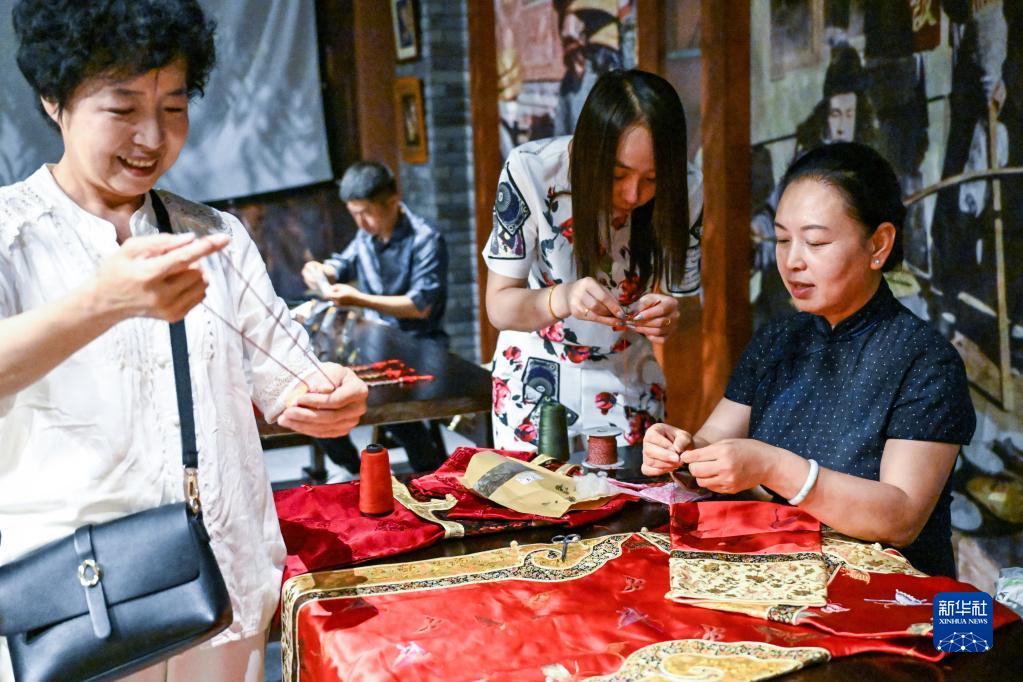 陳玉秋(右一)在吉林市博物館教人們制作端午節香囊(6月19日攝)。