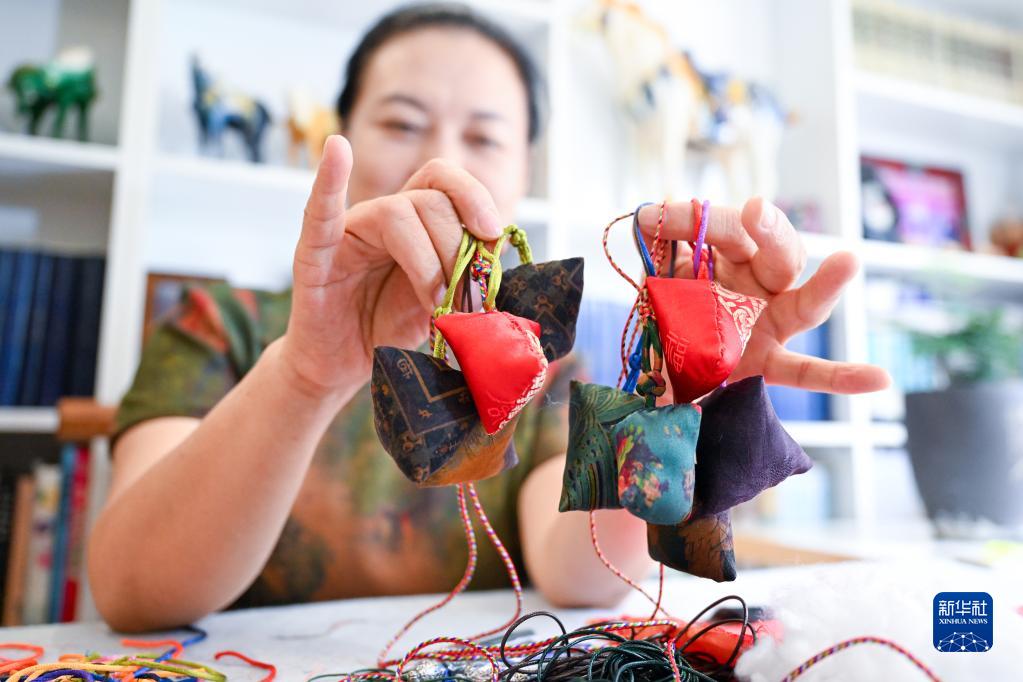 陳玉秋在家中展示端午節香囊(6月20日攝)。