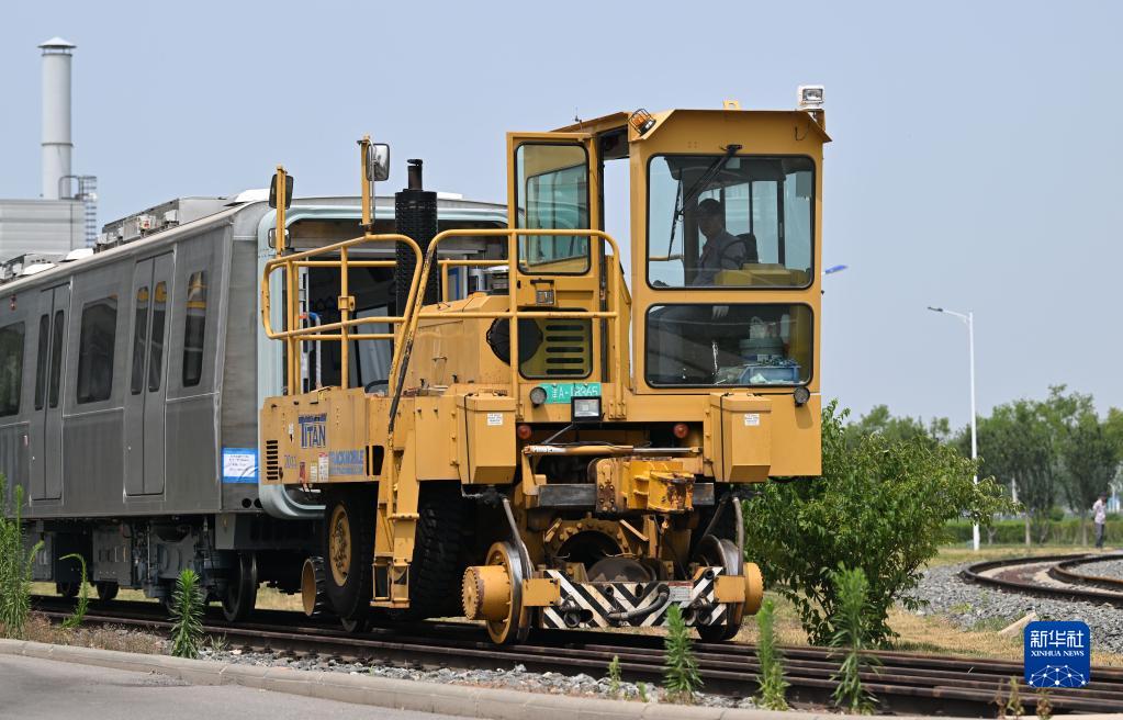 在天津中車(chē)唐車(chē)軌道車(chē)輛有限公司,工作人員駕駛機車(chē)將組裝好的車(chē)體拉往調試車(chē)間(6月20日攝)。