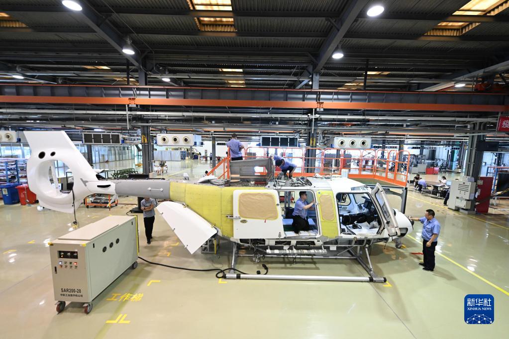 工作人員在航空工業(yè)天津直升機有限責任公司組裝生產(chǎn)一架AC332型民用直升機(6月20日攝)。