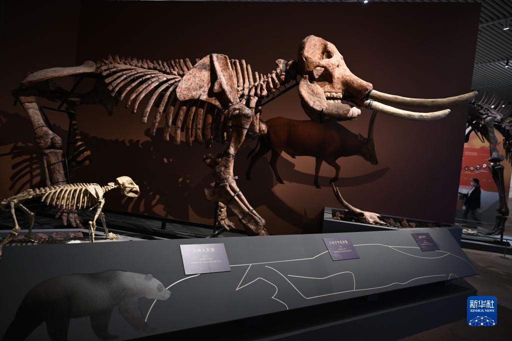 6月21日在北京中國國家博物館拍攝的江南中華乳齒象模型(上)和小種大熊貓模型。