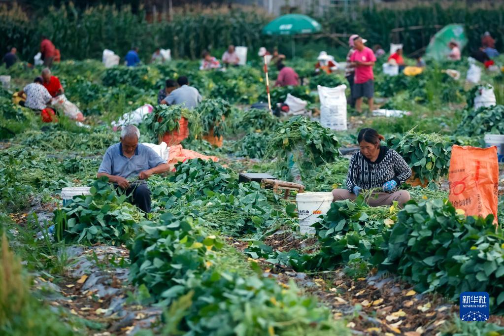 6月19日傍晚,人們在四川省成都市金堂縣官倉街道雙堰社區的田地里采收毛豆。
