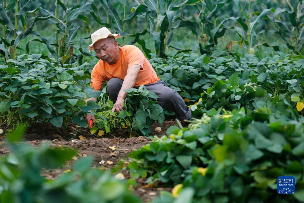 6月19日傍晚,農民劉期玖在四川省成都市金堂縣官倉街道中孚社區21組的田地里采收毛豆。