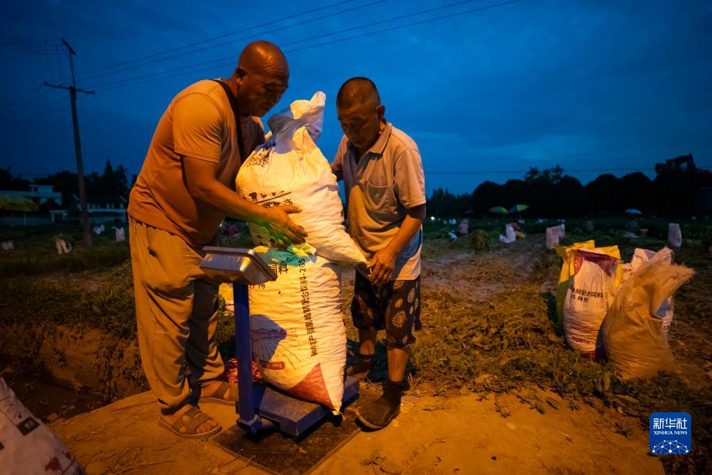 6月19日夜間,在四川省成都市金堂縣官倉街道雙堰社區,種植大戶(hù)易大槍?zhuān)ㄗ螅┰诜Q(chēng)量收獲的毛豆。