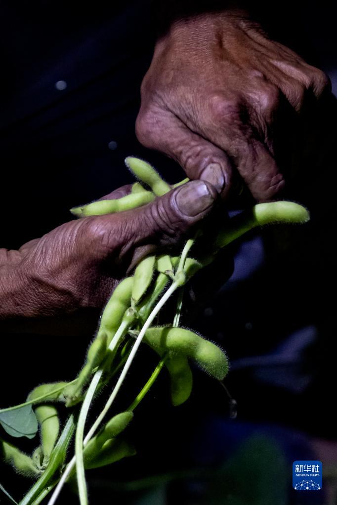 6月19日夜間,在四川省成都市金堂縣官倉街道雙堰社區的田地里,人們借助著(zhù)燈光,抓緊時(shí)間采收毛豆。