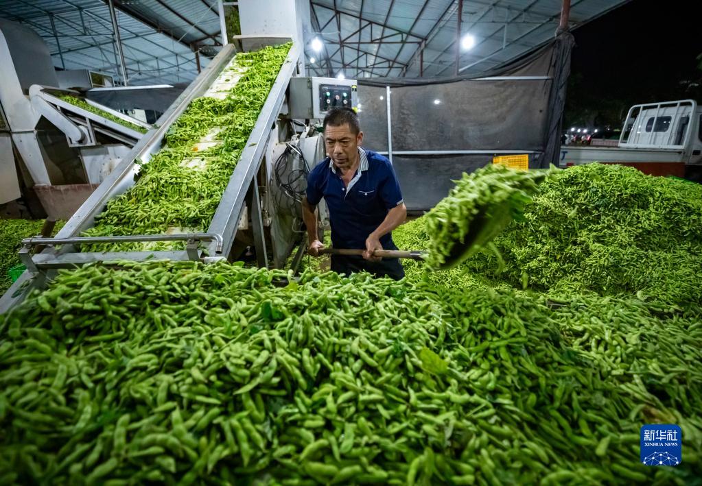 6月19日夜間,在四川省成都市金堂縣官倉綜合(果蔬)市場(chǎng),工人將運來(lái)的新鮮毛豆裝上清洗、挑選流水線(xiàn)。