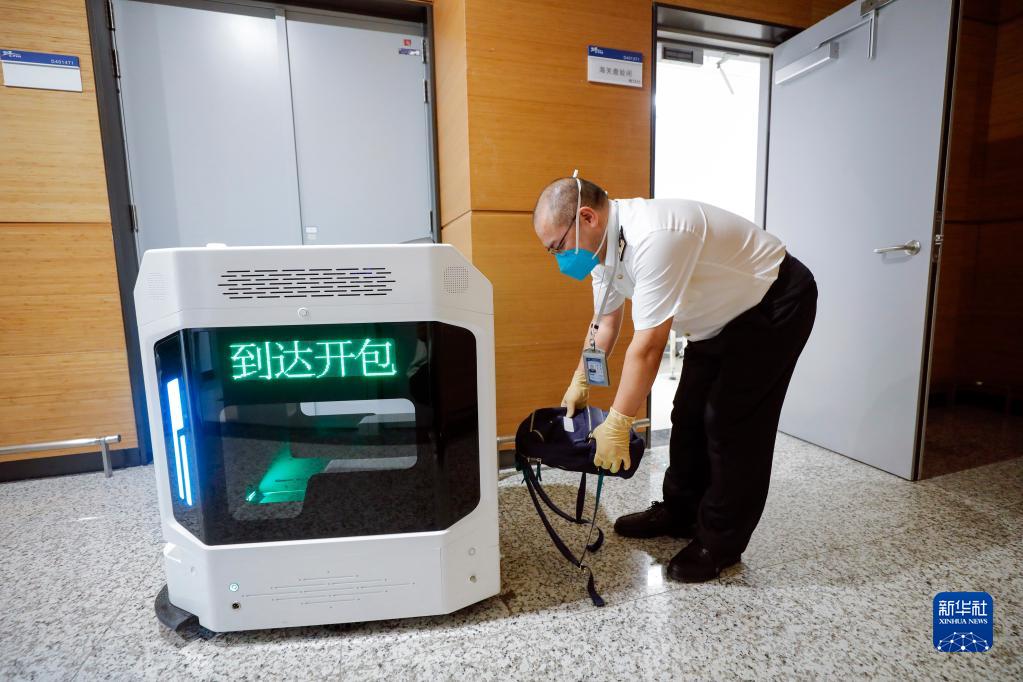 6月21日,在成都天府國際機場(chǎng),成都海關(guān)關(guān)員從手提行李智能攜運機器人中取出異常行李,準備開(kāi)包檢查。