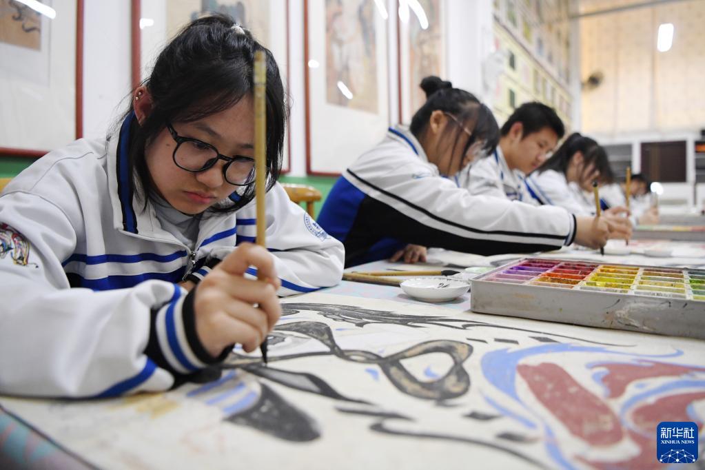 敦煌中學(xué)的學(xué)生在學(xué)校畫(huà)室里體驗敦煌壁畫(huà)的繪畫(huà)過(guò)程,感受敦煌文化的魅力(4月26日攝)。