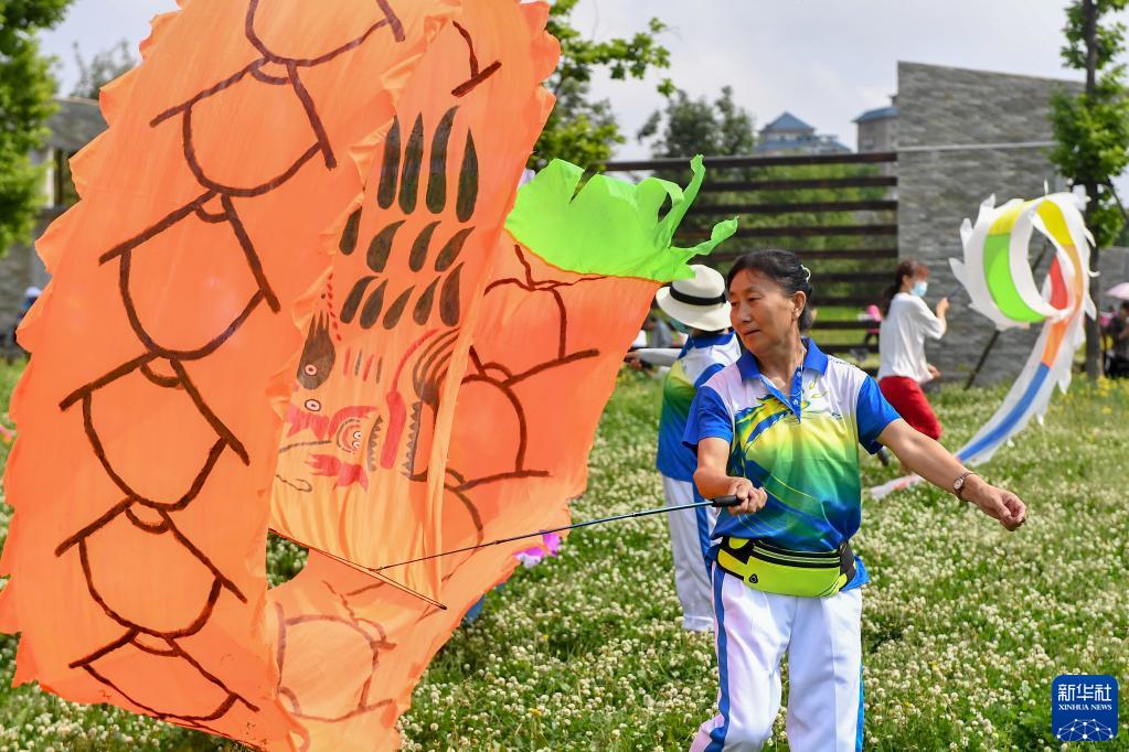 6月22日,市民在吉林省長(cháng)春市伊通河工業(yè)軌跡公園進(jìn)行龍形彩綢表演。