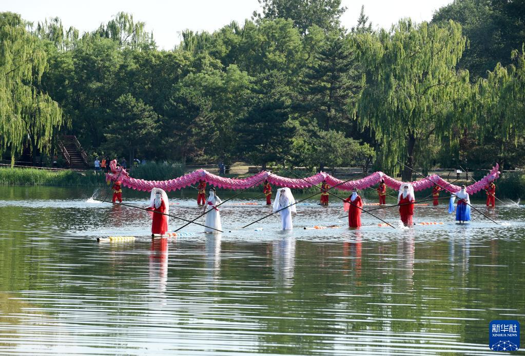 6月22日,獨竹漂表演者在北京圓明園九州景區的后湖進(jìn)行水上表演。