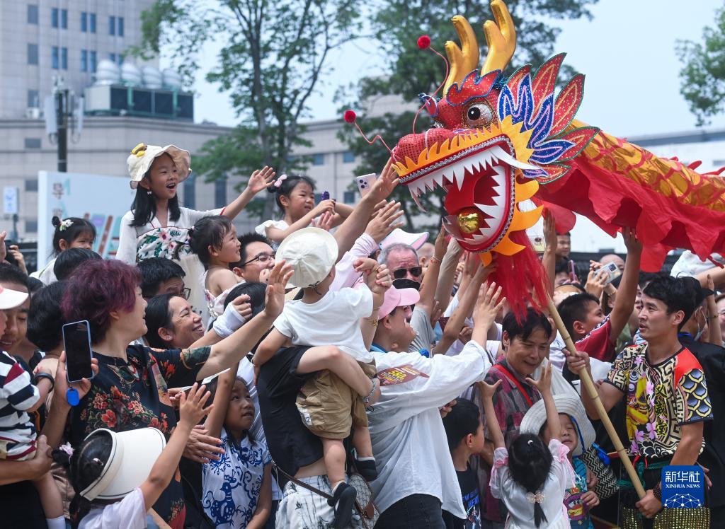 6月22日,浙江嘉興子城遺址公園廣場(chǎng),舞龍隊在與觀(guān)眾互動(dòng)。