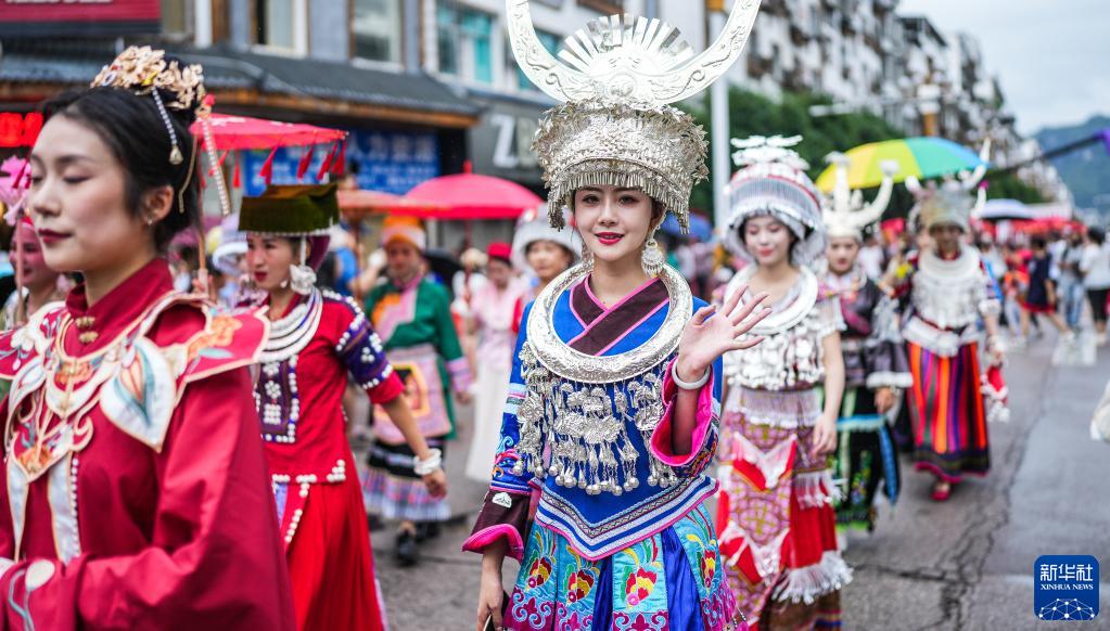 6月22日,在貴州省黔東南苗族侗族自治州施秉縣舉行的獨木龍舟節上,少數民族同胞身著(zhù)盛裝進(jìn)行巡游。