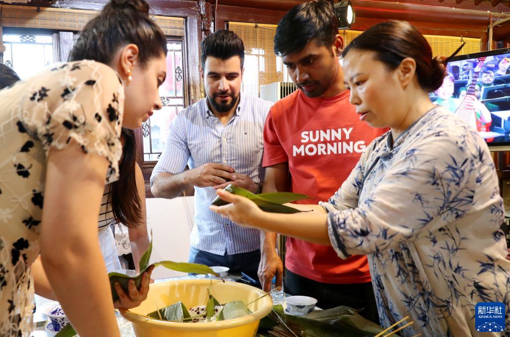 6月22日,在上海青浦朱家角古鎮,留學(xué)生學(xué)習粽子的制作手法。