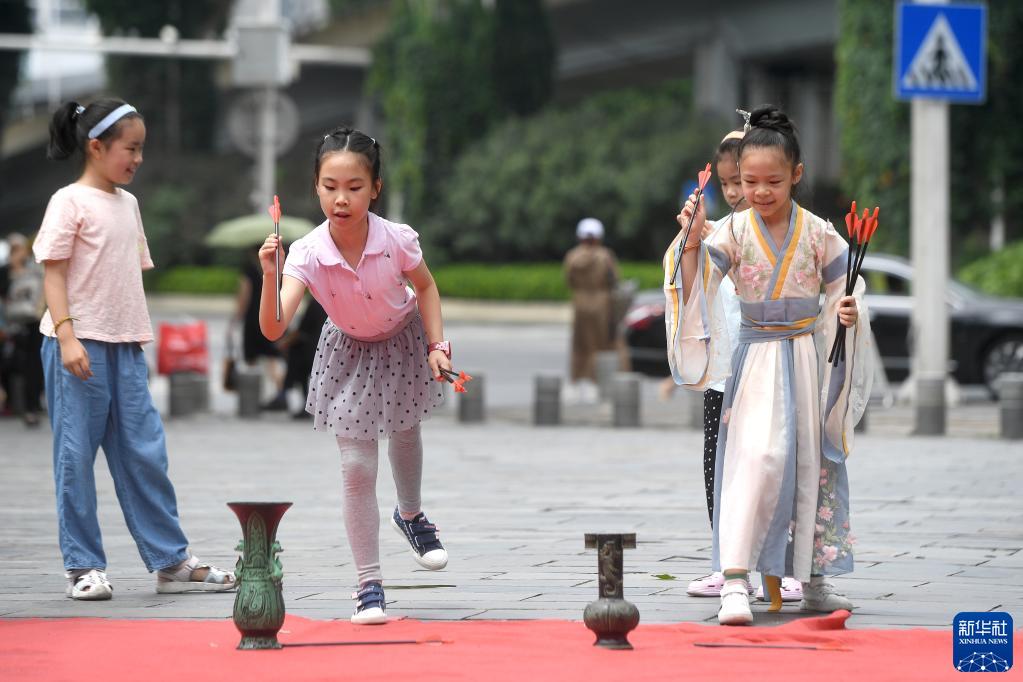 6月22日,小朋友在武漢市堤角公園端午活動(dòng)現場(chǎng)參與投壺。