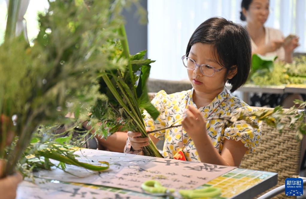 6月22日,小朋友在海南省博物館學(xué)習制作艾草門(mén)掛。