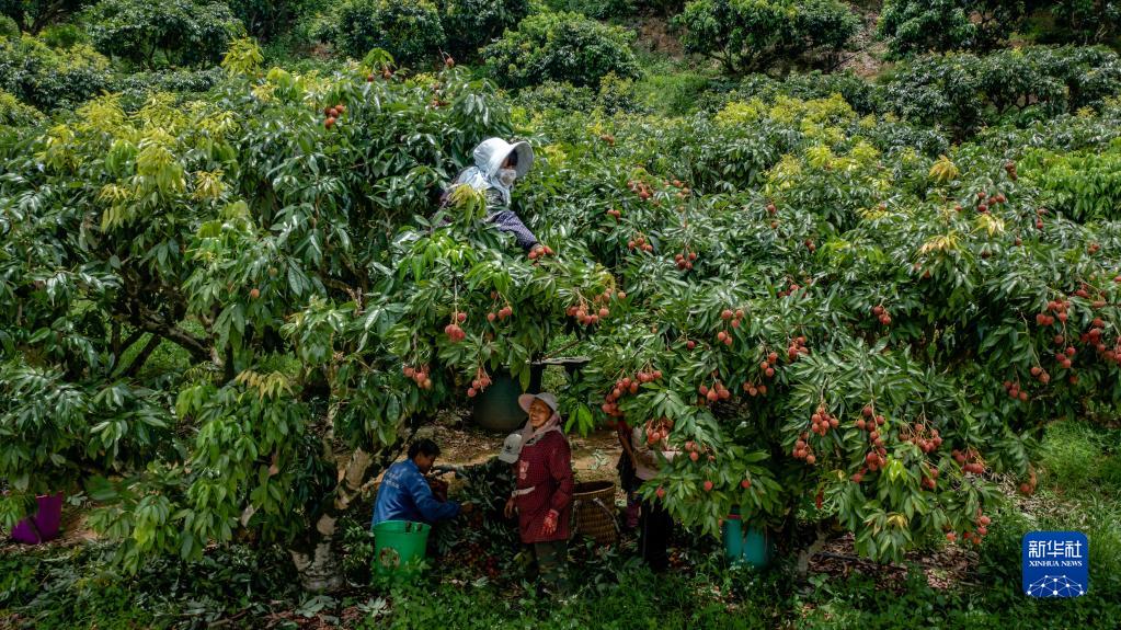 果農在云南省屏邊縣灣塘鄉米坡荔枝基地采摘荔枝(6月21日攝,無(wú)人機照片)。