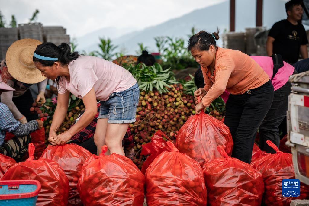 果農在云南省屏邊縣灣塘鄉米坡荔枝基地將分揀好的荔枝裝袋(6月21日攝)。
