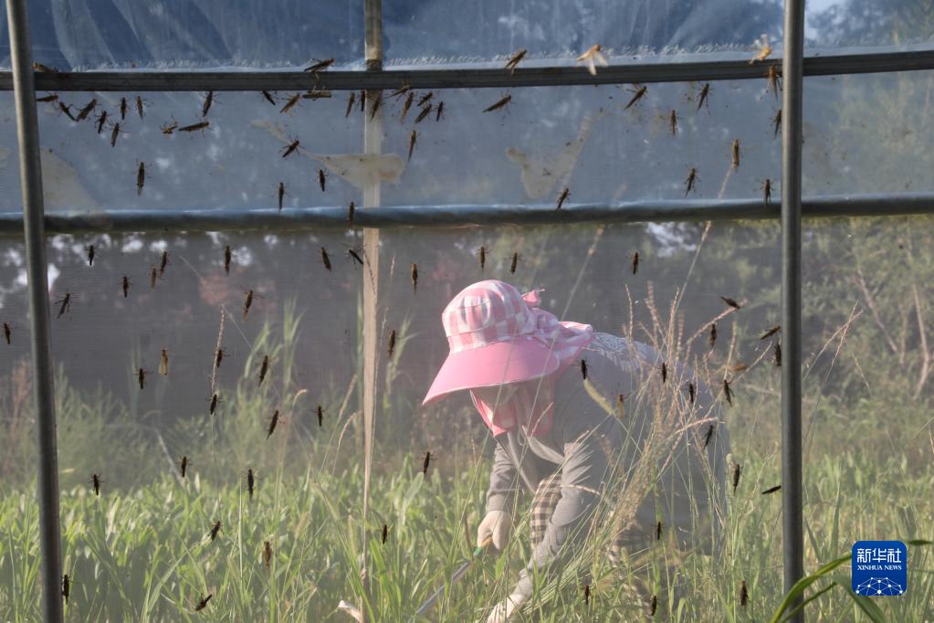 6月21日,山東省樂(lè )陵市西段鄉岔河村東亞飛蝗養殖基地的螞蚱養殖戶(hù)在割草。