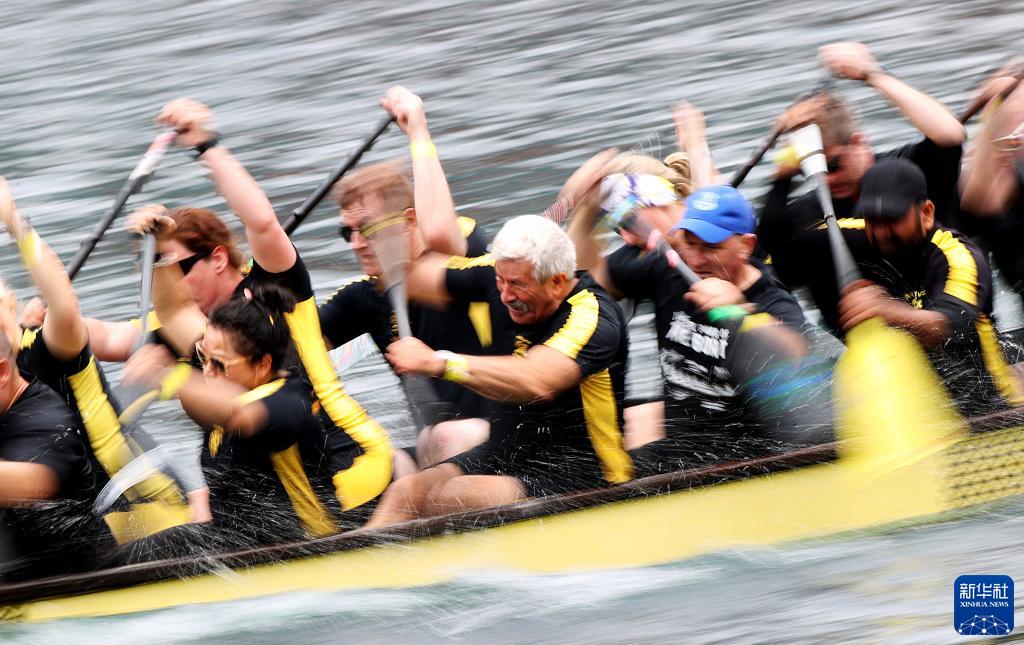 6月18日,戴維·邦斯(中)和Amathus龍舟俱樂(lè )部其他選手在英國索爾福德市參加2023年全英中華端午龍舟會(huì )專(zhuān)業(yè)組比賽。