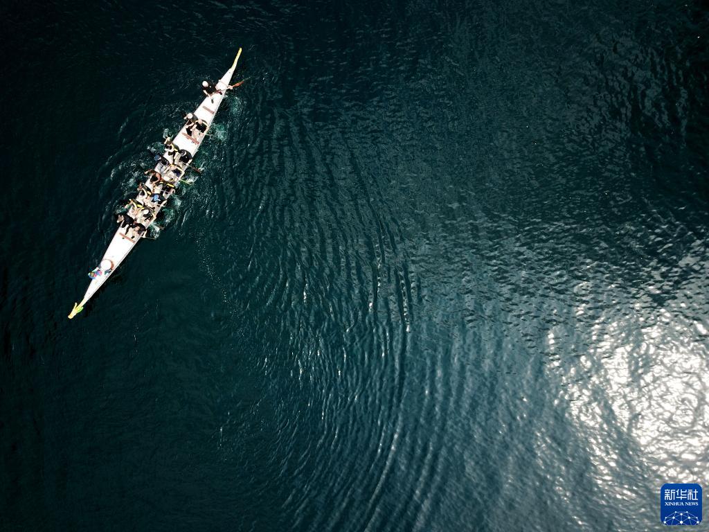 6月18日,Amathus龍舟俱樂(lè )部選手在英國索爾福德市舉行的2023年全英中華端午龍舟會(huì )專(zhuān)業(yè)組比賽中角逐(無(wú)人機拍攝)。