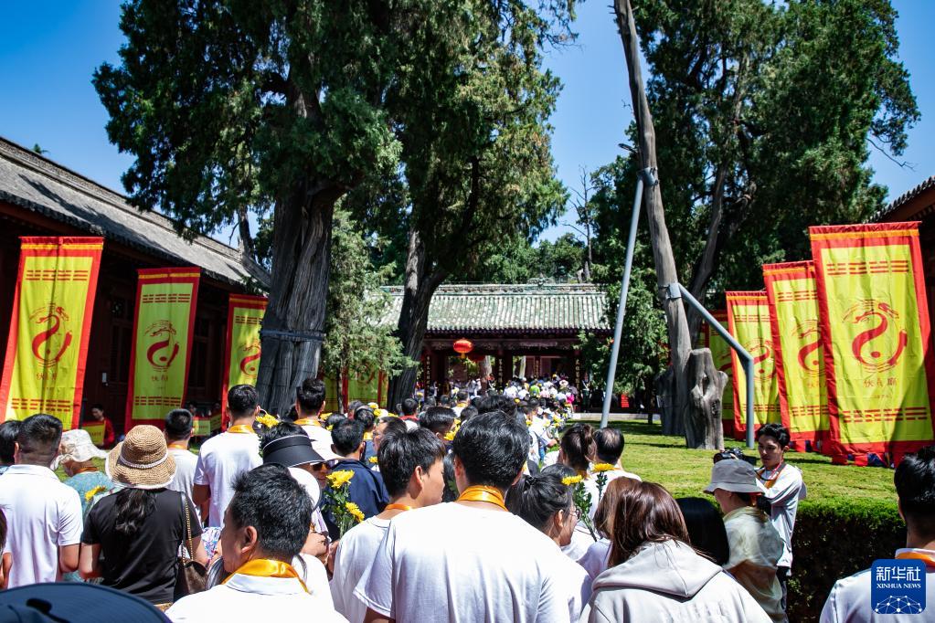 6月22日,人們參加完公祭伏羲大典后進(jìn)入伏羲廟內獻花拜祖。
