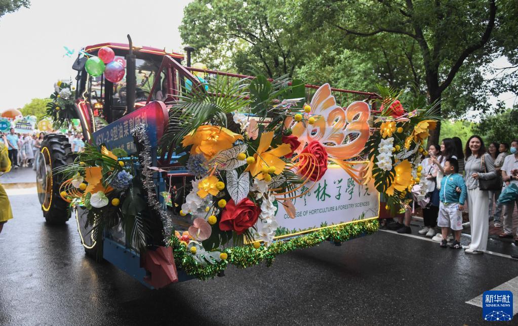 當日,為迎接畢業(yè)季,華中農業(yè)大學(xué)舉行了一場(chǎng)花車(chē)巡游,學(xué)生們簇擁著(zhù)由現代農機裝備組成的花車(chē)隊伍,在校園里巡游,慶祝畢業(yè)、致敬青春。